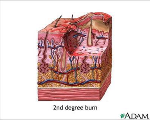 affected. Skin is red and dry, swollen and usually painful. Top layers are burned. Skin will be red and have blisters. These burns are usually painful. All the layers of the skin and underlying tissues